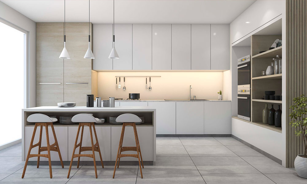 Today's modern design incorporates what is currently on trend, such as natural materials and soothing pastel paint tones, with contemporary style accents such as clean lines or sharp line transitions for added personality without getting too specific about which one. the style is being imitated by this new generation - although you can expect these elements to be more minimalistic than their predecessors so they won't completely overwhelm your space! To avoid stucco or raised panels like in classic kitchens (which would make it stuffy), modern cabinets should have a smooth, flat surface. Thus, you can achieve cleanliness and spaciousness in your kitchen!